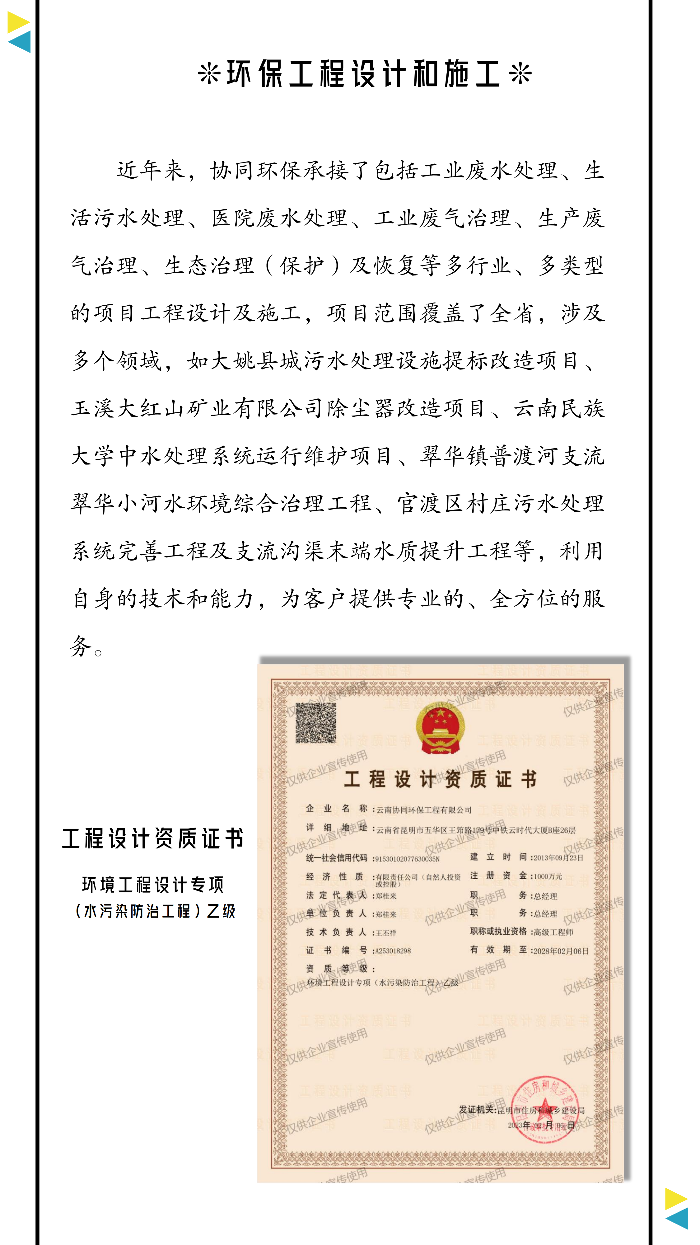 云南協(xié)同環(huán)保工程有限公司可承接工業(yè)廢水處理、生活污水處理、醫(yī)院廢水處理、工業(yè)廢氣治理、生產(chǎn)廢氣治理、生態(tài)環(huán)境綜合治理(保護(hù))等類型的工程。項(xiàng)目范圍覆蓋全省,涉及多個(gè)行業(yè),如大姚縣城污水處理設(shè)施提標(biāo)改造項(xiàng)目、玉溪大紅山礦業(yè)有限公司除塵器改造項(xiàng)目、云南民族大學(xué)中水處理系統(tǒng)運(yùn)行維護(hù)項(xiàng)目、翠華鎮(zhèn)普渡河支流翠華小河水環(huán)境綜合治理工程、官渡區(qū)村莊污水處理系統(tǒng)完善工程及支流溝渠末端水質(zhì)提升工程等。