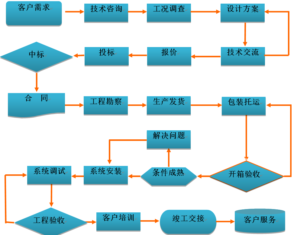 我公司經(jīng)過多年的經(jīng)驗(yàn)總結(jié),形成了一套完整合理的客戶服務(wù)流程體系,服務(wù)流程包括銷售服務(wù)、系統(tǒng)設(shè)計(jì)、采購、生產(chǎn)、檢驗(yàn)、工程實(shí)施、投運(yùn)、維護(hù)等各個(gè)環(huán)節(jié)。公司對(duì)相關(guān)的服務(wù)流程持續(xù)的完善和優(yōu)化,使系統(tǒng)服務(wù)的質(zhì)量管理更加標(biāo)準(zhǔn)化、程序化、規(guī)范化,為系統(tǒng)服務(wù)工作奠定了扎實(shí)的基礎(chǔ)。