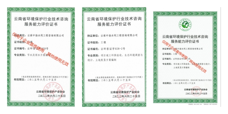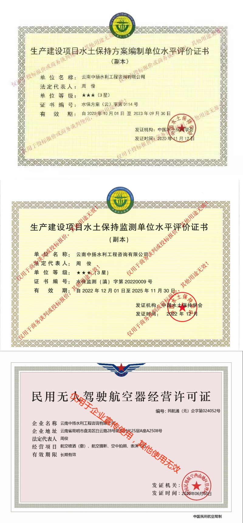 云南中揚(yáng)水利工程咨詢(xún)有限公司成立于2011年,注冊(cè)資金100萬(wàn)元整。公司從事的主要業(yè)務(wù)為生產(chǎn)建設(shè)項(xiàng)目水土保持咨詢(xún)?cè)O(shè)計(jì)(水保方案編制、水保監(jiān)測(cè)、技術(shù)評(píng)估及咨詢(xún))、水土保持規(guī)劃、水利工程設(shè)計(jì)(農(nóng)田水利、河道)、可行性研究報(bào)告編制、土地復(fù)墾等。公司已取得水土保持方案編制、水土保持監(jiān)測(cè)、工程咨詢(xún)備案、環(huán)境污染治理、環(huán)境保護(hù)行業(yè)技術(shù)咨詢(xún)服務(wù)能力評(píng)價(jià)證書(shū)、民用無(wú)人駕駛航空器經(jīng)營(yíng)許可證等資格證書(shū),是云南省水土保持學(xué)會(huì)和云南省環(huán)境保護(hù)協(xié)會(huì)會(huì)員。
