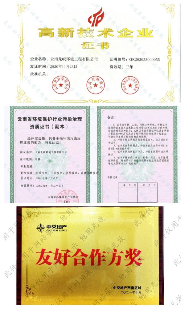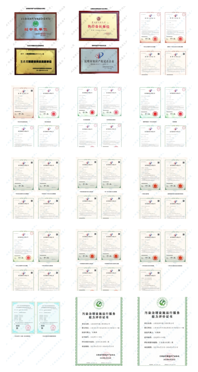 公司持有環(huán)保工程專業(yè)承包二級、市政公用工程總承包三級、建筑工程總承包三級、污染治理乙級、污染治理設(shè)施運(yùn)行服務(wù)二級資質(zhì)證書。前后獲得“十二五”生態(tài)文明建設(shè)突出貢獻(xiàn)單位、云南省省級成長型中小企業(yè)、云南省知識產(chǎn)權(quán)優(yōu)勢企業(yè)、云南省科技型中小企業(yè)、云南省專精特新中小企業(yè)、招商蛇口最佳合作伙伴、中交置業(yè)友好合作方獎(jiǎng)等榮譽(yù)。